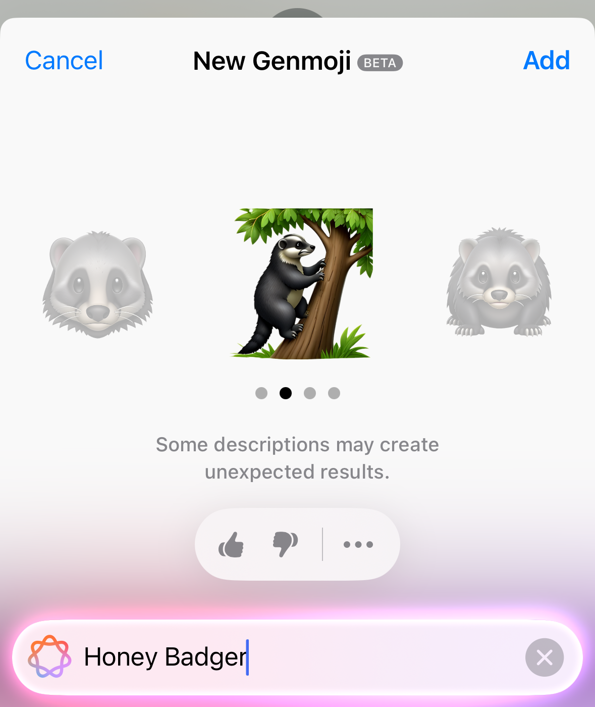 Following a prompt, the Genmoji tool generates multiple variants of the emoji image design once the user as submitted the prompt, which the user can then scroll through to select their preferred generated emoji design.